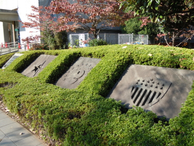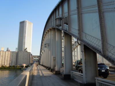 鉄骨製だからなのか、橋の歩道の途中に鋲を打ってあるような意匠が施してありました。つるんとか転ばないのかな…。橋のたもとのオブジェにも鋲かネジのデザインがありました。