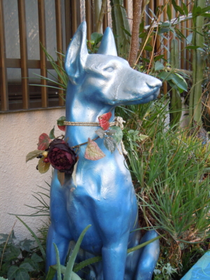 近寄ると、いぶし銀の犬と、割ったCDで着飾った鳥の姿のプランターカバー