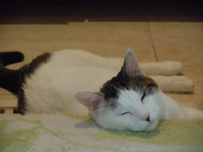 玄関の石の上に広がって、ひえひえ快適の王様。ドアも少し開けているので風通しも申し分ないようです。で、玄関でのなでなでをご所望。