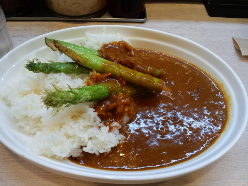チキンカレーにアスパラトッピングにしました。素揚げしたアスパラうま~。