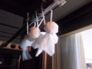 明日、ねずみの海の国へ行くムスメが物干しにぶら下げたのだけど風で吹き飛ばされそうです。