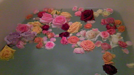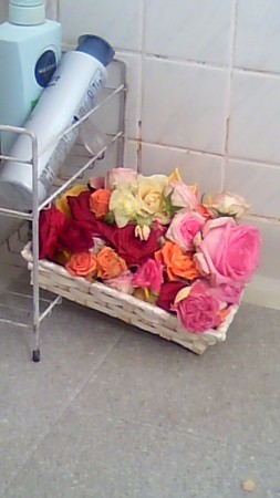 自宅薔薇風呂の様子。この入浴用の薔薇、パッケージ表面の薔薇の下にもけっこうぎっちりミニ薔薇などが詰まっていました。
