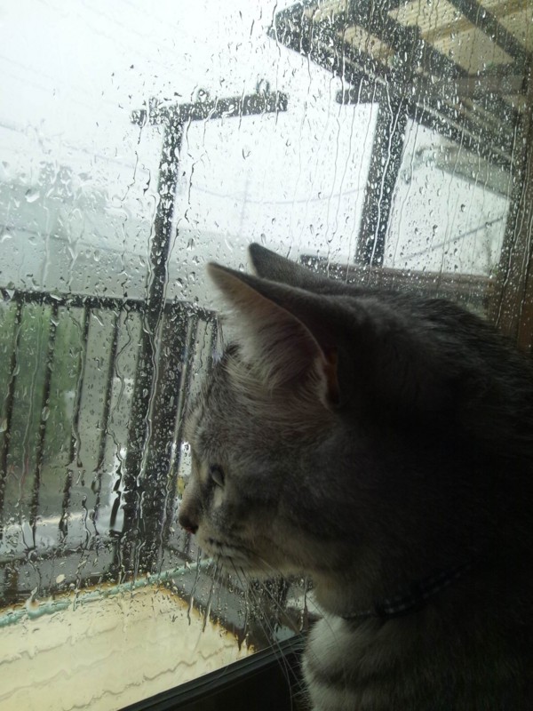 暴風雨の中悠々とヒルナンデスを見るワタス。