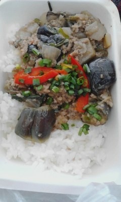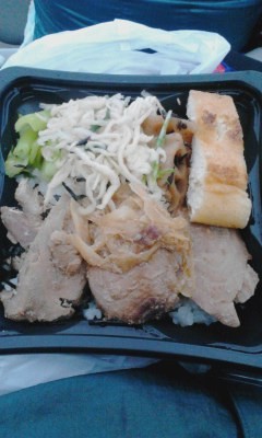 鮪の脳天ステーキ丼です。白いのは、切り干し大根のお惣菜でした。
