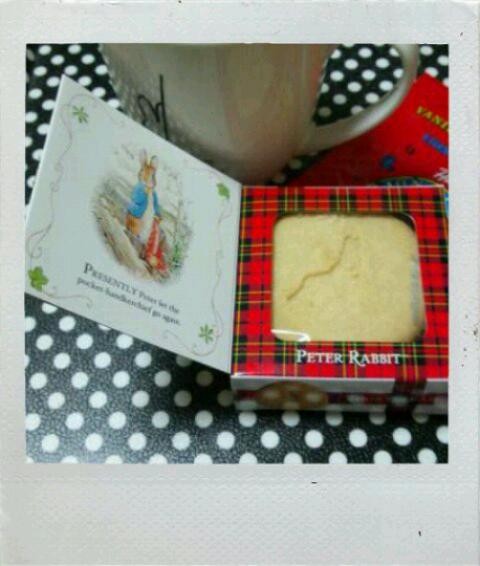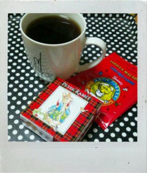 昨日アウトレットで買ったピーターラビットのショートブレッドとライオンコーヒーマカダミア♪