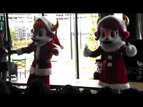 「バファローブルとバファローベルが神戸市の「OGMゴルフプラザ神戸」で行われたイベントに、サンタクロース姿で参加した。」