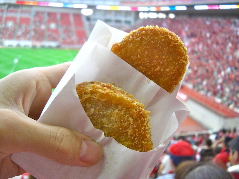 先週末のカシマスタジアムにて、茨城県龍ケ崎市にある高橋肉店のコロッケ(上)と常陸牛コロッケ(下)。