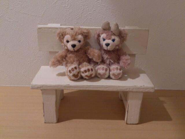 先日3COINSで購入したベンチにダッフィー&シェリーメイを座らせて玄関に飾ってみた(・w・)