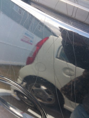 見えるかな?マイカーの後部座席のドア傷だらけー。乗せろ乗せろとうちの犬にカリカリやられました。爪伸びてないから大丈夫だと思ってたのにぃ(;´д`)