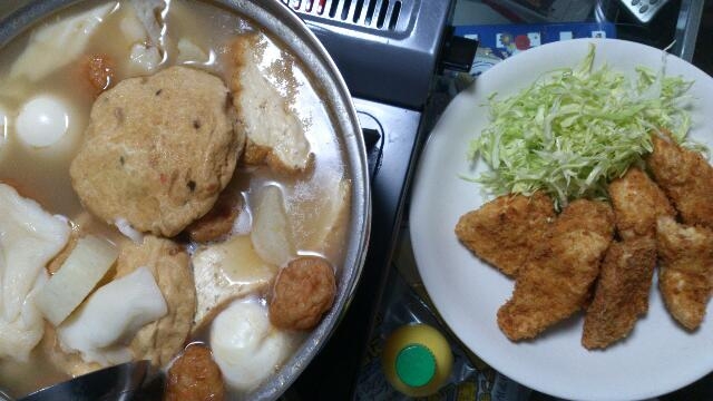 おでんとかじきのフライとたことワカメの酢の物、そして炊き込みご飯。