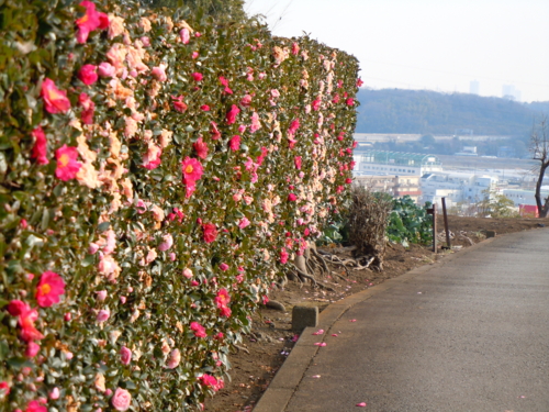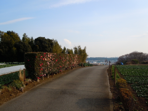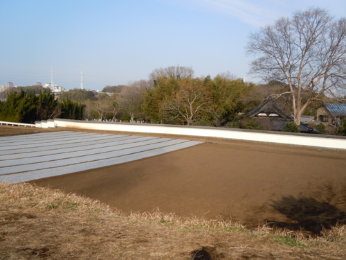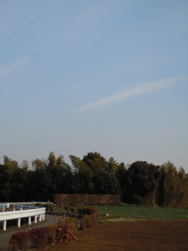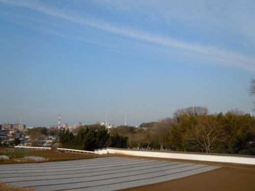 雲が畑に影を落とし、肌理の揃った土の上を流れる様は、天のネガフィルムを見ているようでした。この長い白い土塀の前を、二人ぽつぽつ歩く老夫婦の姿も見えました。