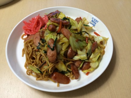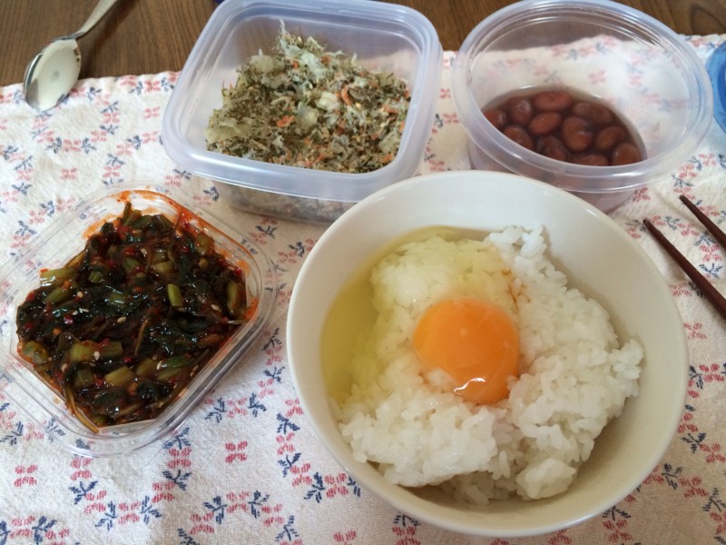 おかずは、昨日買った青菜と昆布入りキムチ、3日ほど前に炊いた金時豆、お不動さんの出店で買ったタラと昆布なんかのふりかけ。