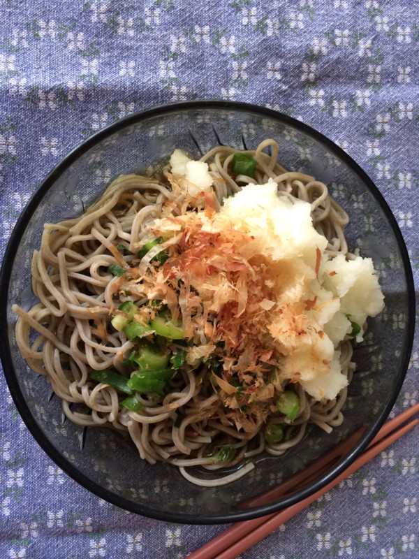 冷凍のうどんを茹でて冷やしたのに、残っていた青じそとミョウガを刻んだのと山形の「だし」をトッピングして「冷やしぶっかけうどんのタレ」をかけて。思いつきで、買ってあった温泉卵ものせてみた。