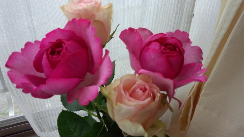 コインランドリーの帰りに買ったバラと、手折ってきたうちの畑の梅。