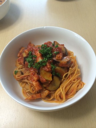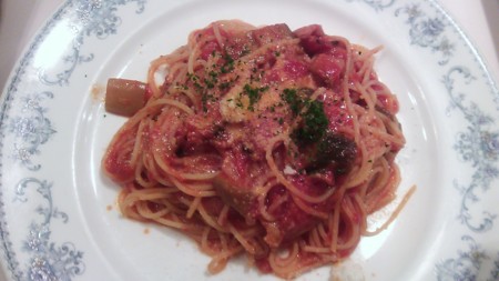 パスタは茄子とソーセージのトマトソースパスタです♪