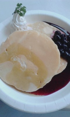 上:リコッタチーズのパンケーキ。メイプルとブルーベリーのソースです。「今日は特別!」と、ソースを2種類におまけしてくれました♪