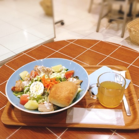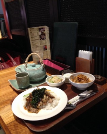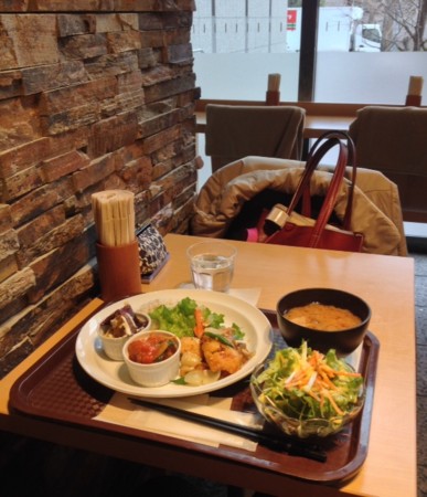 心電図検査機器取り外し完了! オーガニックのお店で玄米ごはん、白身魚野菜あんかけ、ラタトゥイユ、芋かぼちゃサラダ、お味噌汁。食後にジンジャーミルクを天窓のある二階で飲んでる。