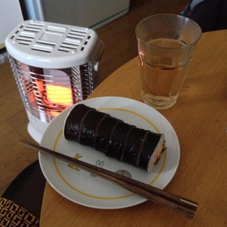 恵方巻を普通にカットして、いつものテーブルでいつもの向きで。いや、酢飯とか海苔巻きが食べたいところで、ちょうどよかったなと思って。