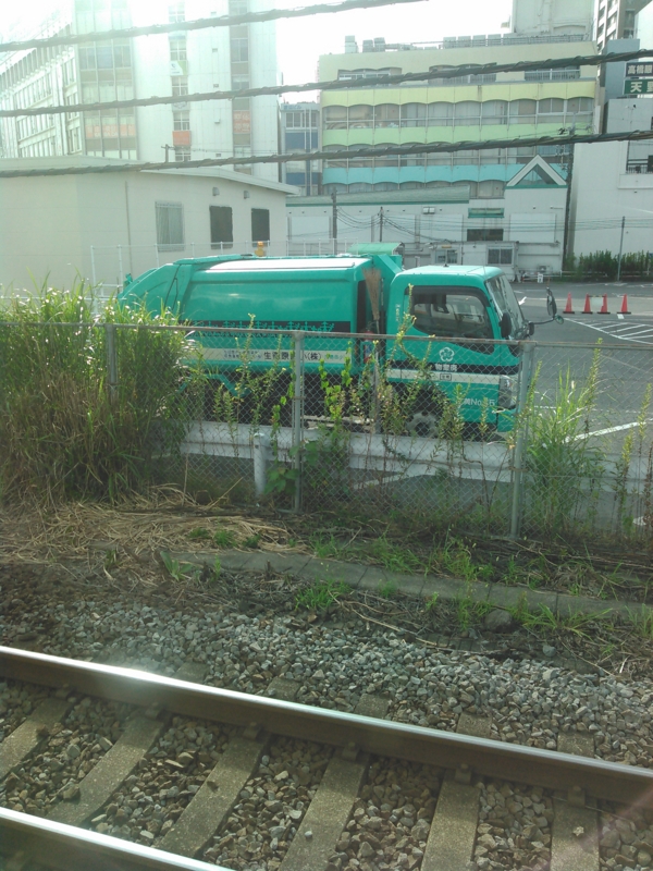 車窓の田園風景には用水路沿い曲がり角で脱輪し傾いた4トントラックとそれを取り巻く人々