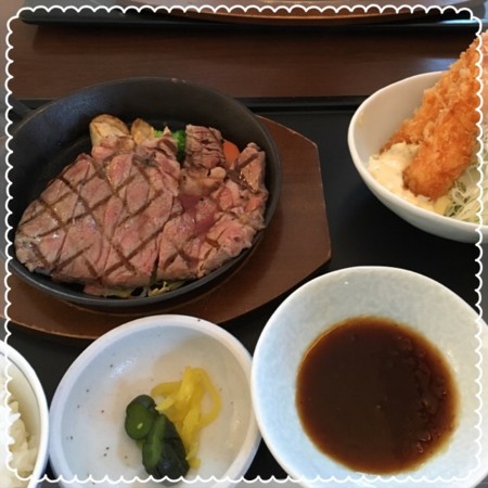 ステーキと海老フライ定食!(*゚∀゚)=3