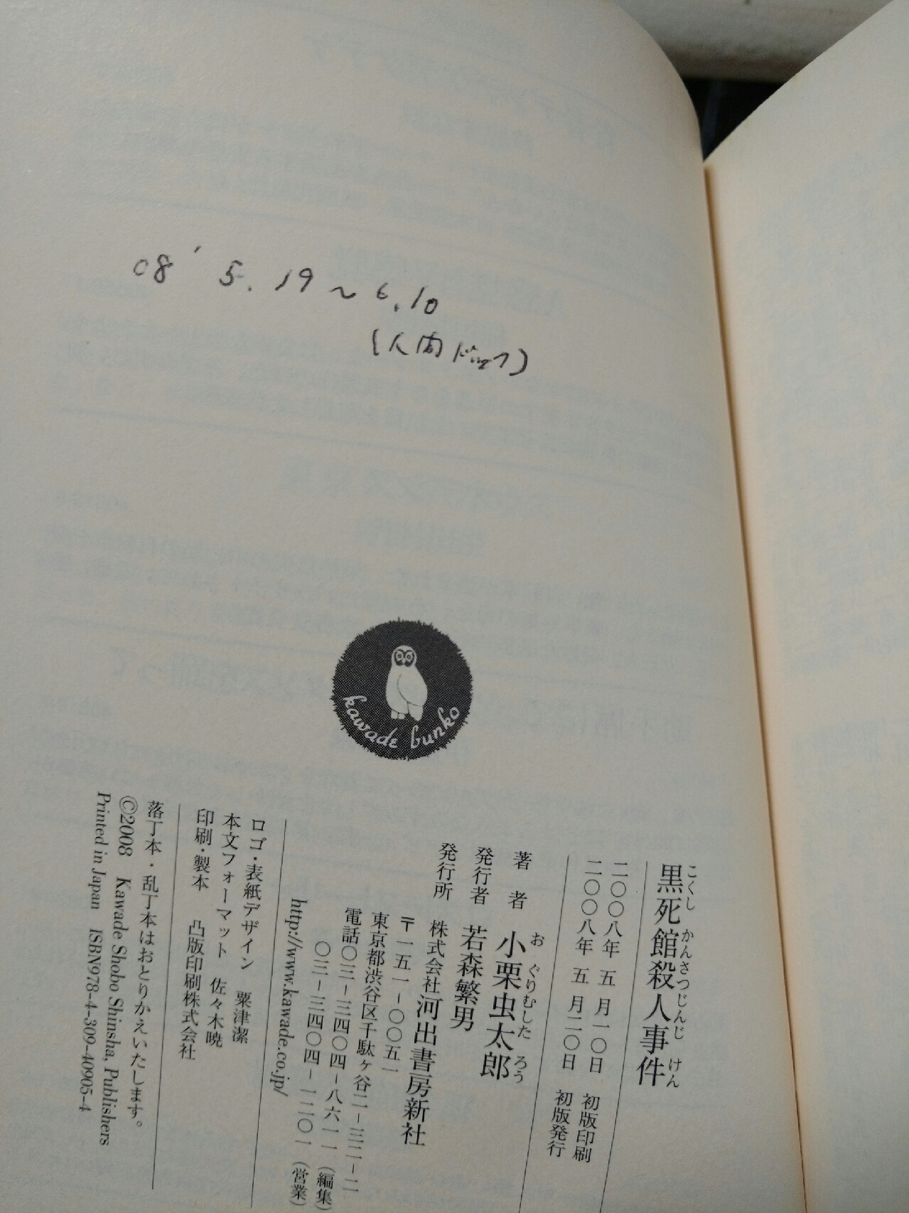 前に古本屋で購入したまま積ん読していた『黒死館殺人事件』の文庫をふと手にとって奥付を見てみたら、ページの上の方に割りと切ない感じの覚書が手書きで記されていた。ひとつ気になるのは、予定されている人間ドックの日付が、書籍の発行日と被っている点だ。Amazonに登録されている同書籍の発売日は2008年5月2日となっている。初代所有者である人間ドック氏は、この本の発売からほとんど日を置かずに新刊で購入したと考えられる。人間ドックの件について日曜祝日にわざわざ連絡するとも思えないから、GW明けの5月7日から5月19日までの間に人間ドックについて電話でやりとりをして、買ったばかりで通読中の文庫の奥付をメモ帳代わりに利用した。そんな時、わざわざ電話を切らなくてもアプリを立ち上げてそのままメモが取れるんです。そう、iPhoneならね。(iPhone3G 2008年7月11日発売)
