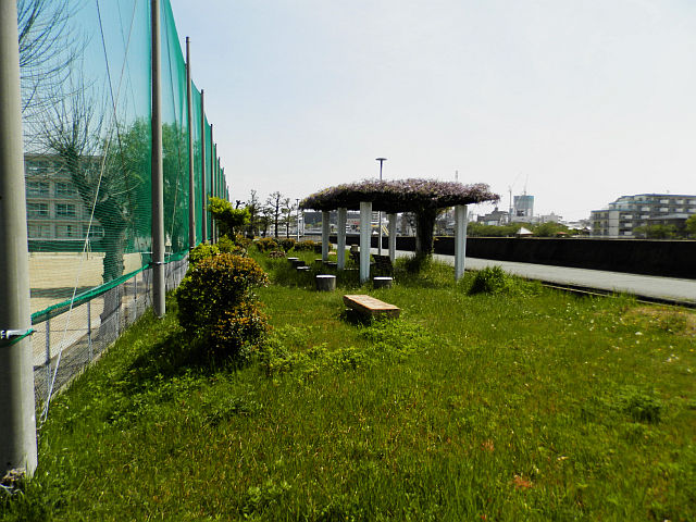 衣川中学校のグラウンド裏あたりに、何となく堤っぽさが残っています。衣川っていうのは明石川の別名だそうです。