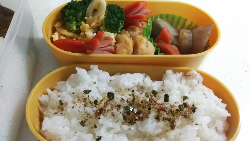 昨日の、「玉ねぎを豚肉で巻いて、小麦粉をふって、トマトピューレとバルサミコ酢と醤油と砂糖のタレをからめたもの」弁当〜