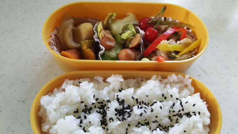 あのね、まだ涼しいから久しぶりにやるかと思って朝昼(涙)の分と夜の分の弁当を作ってきたわけです。これは昼の分。(内容は同一)