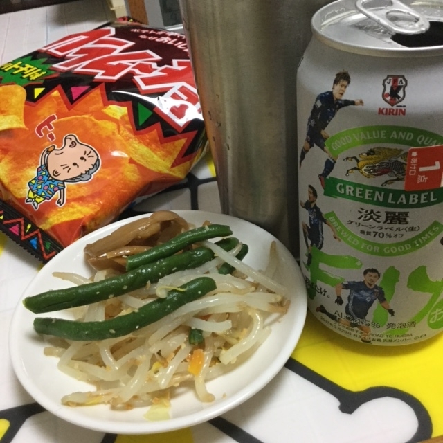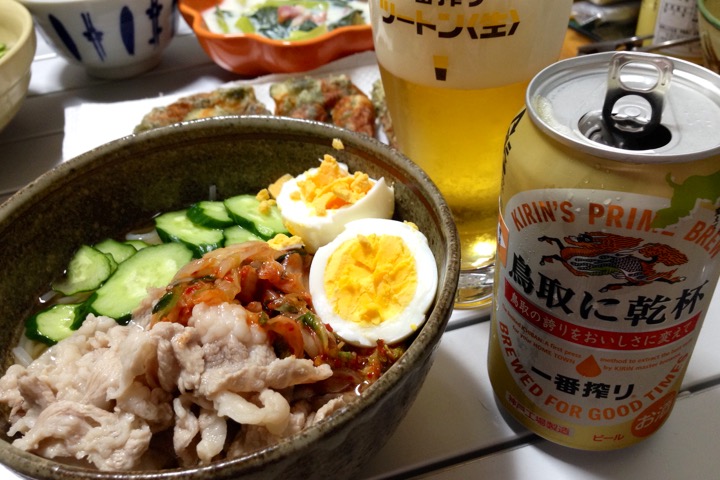 ビールのおともは冷麺、ちくわの磯辺揚げ、青梗菜のクリーム煮。
