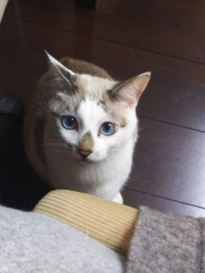 いつもより可愛い顔(表情)を作って何とか貰おうと必死だな…。でも塩分高いから、あげないんだよ!