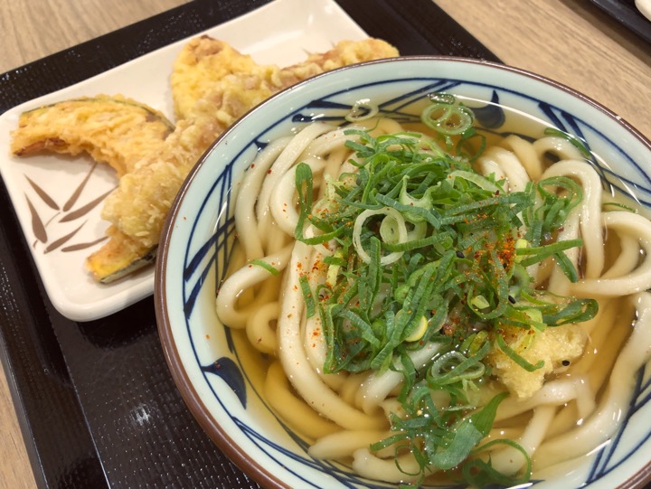 丸亀製麺でぶっかけうどんと天ぷら(ちくわ、かぼちゃ、はす)をいただきました。