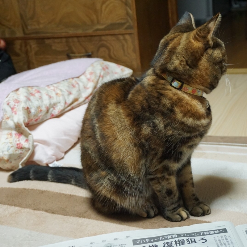 おこた布団の上で寝ていても、起きると当然のように膝に乗ってくるが、写真を撮ろうとすると手を噛むので、まともに写真が撮れない。