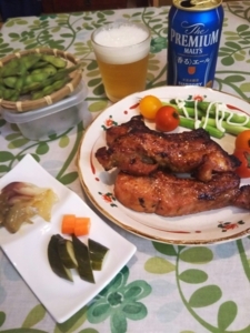 2日間タレに漬け込んでおいたスペアリブをグリルで焼いてポケモンイベント最終日にいただきます。
