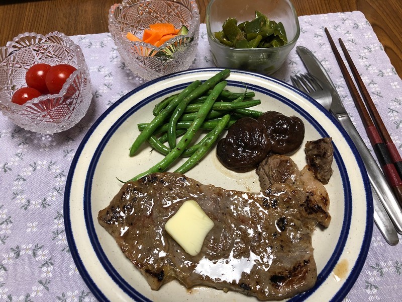 昨日イオンでオージービーフのサーロインステーキ用が30%オフになっているのを見て、「このお肉らしいお肉を食べたいっ!」という気持ちが抑えられず、ついカゴに放り込んでしまったの。はぁ〜、満足。