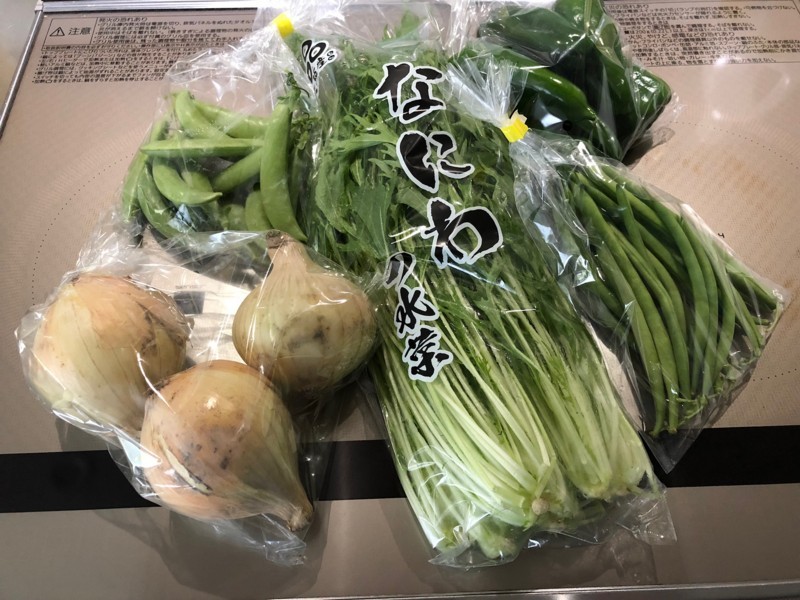 水菜、ピーマン、三度豆、スナップエンドウ、たまねぎ各1袋100円
