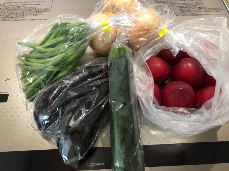 玉ねぎ多過ぎるかなあと思ったけれど、小振りなやつがほしくて、それがこの袋しかなかったもので。あと、お茄子は大きな長茄子が4本くらい入った袋も100円だったのでそちらと迷ったけれど、普通のの方がいろいろに使いやすいから。