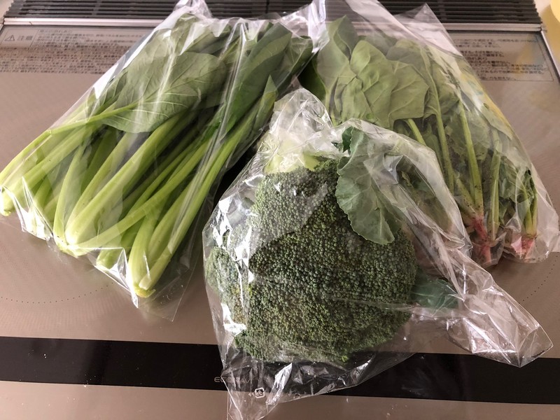 ほうれんそう、小松菜各10円。ものすごく立派なブロッコリーは150円だけど最後の1個だった。