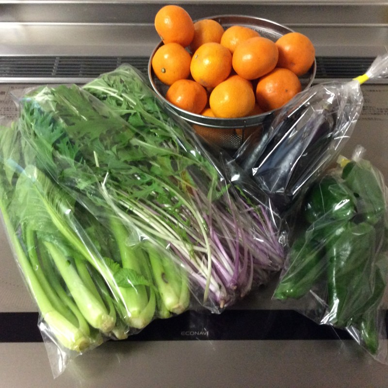小松菜、サラダ水菜(茎が紫)、ピーマン大6個、ナス小3個、各百円