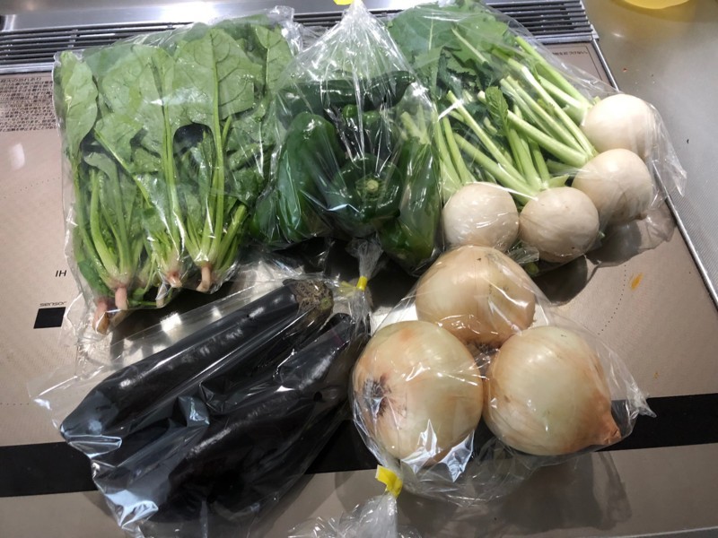 ほうれんそう、かぶら(小)、たまねぎ、なす、ピーマン