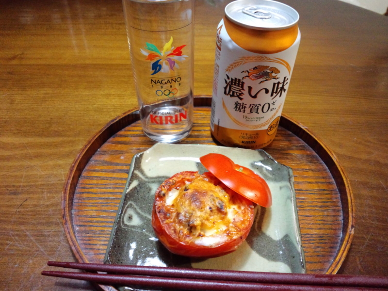 バレーボールを待ちながら、塩麹トマト(実家産)とビールをいただきます!