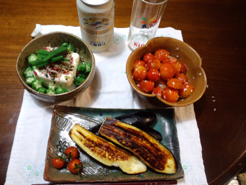 あとは、オクラ&冷や奴、梅高菜ジャコ乗せと、茄子オリーブ油焼きです。