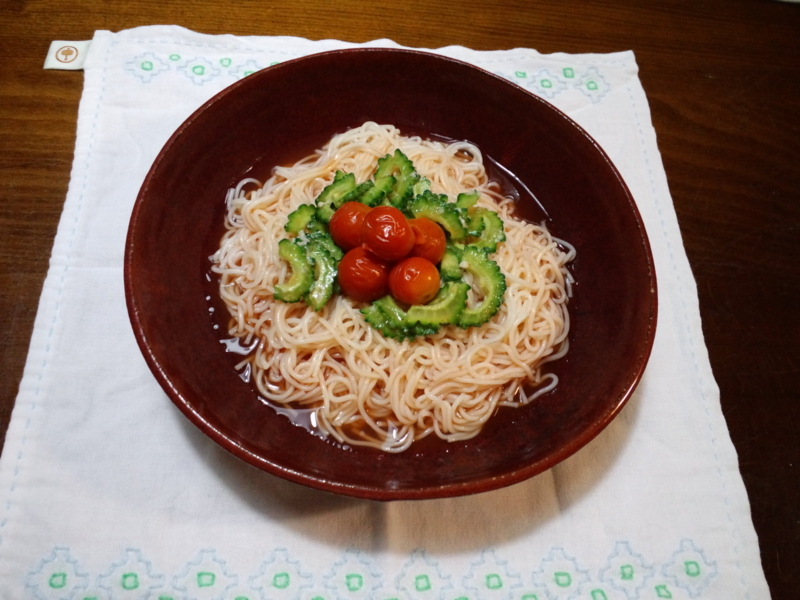塩麹ゴーヤと焼きプチトマトのウーメン、トマトつゆ。