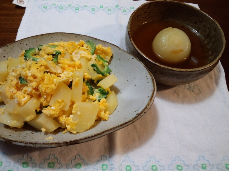 1時間くらい塩麹まみれにして、水分をぎゅっと絞ったゴーヤと、とろけるチーズをいっぱい入れたスクランブルドエッグ。