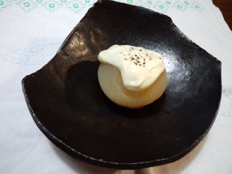 昨日の丸焼き玉ねぎを冷やしたものに、ヨーグルト+マヨネーズ+塩麹、ちょっと黒胡椒です。ヨーグルト+マヨネーズは1:1でも、塩麹が入ると薄まりません。