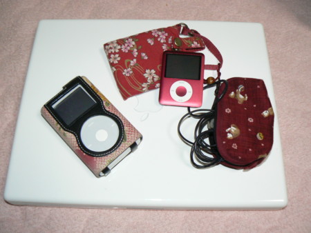 左のは、ミヤビックスのちりめん柄専用ケースに入った第4世代iPod。