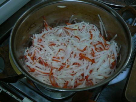 そこに湯通しして絞って崩した豆腐を加え、さっきの大根とにんじんの水気を絞ってまぜると、こんなふうなおなますの出来上がり。