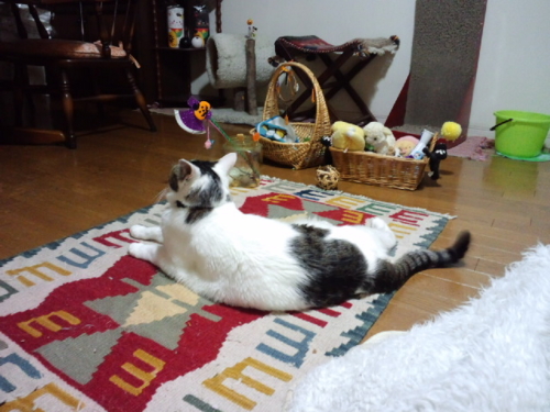 ごまふく、やせて見えるポーズで、王様を見つめる