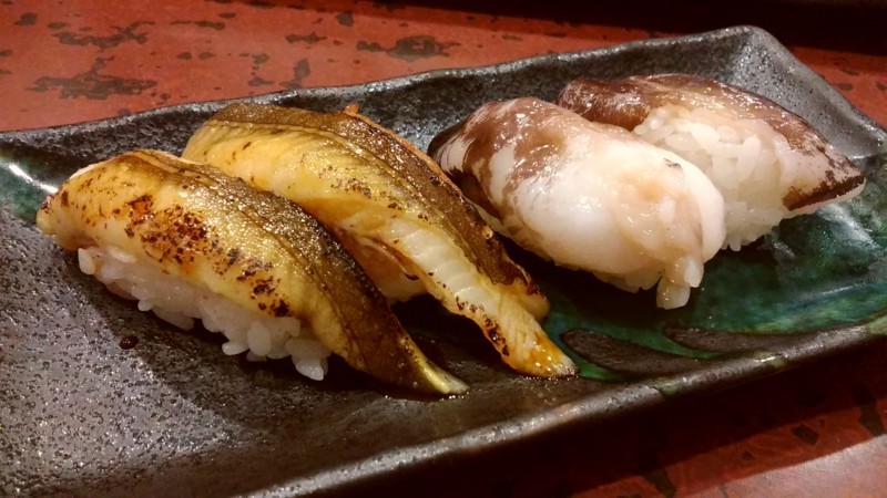数の子とひたし豆、青柳のぬた、写真にないけど寿司ネタのワラビをつまみでもらい、地酒(群馬の水芭蕉)を啜ります。続く第2ラウンドは〆鯖と迷いながら(あとで小肌をつまみたいし)鰯とつぶ貝の肝をいただいて、お腹も落ち着きつつある中で、何を握ってもらうか熟考のため一旦、お店の外で一服。目移りするけどお腹の空き容量に限りがあるのでここは頭を使います。