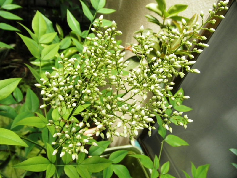 2008年の暮れに寄せ植え用に買って、そのあと地植えにしたナンテン。初めてつぼみをつけました。