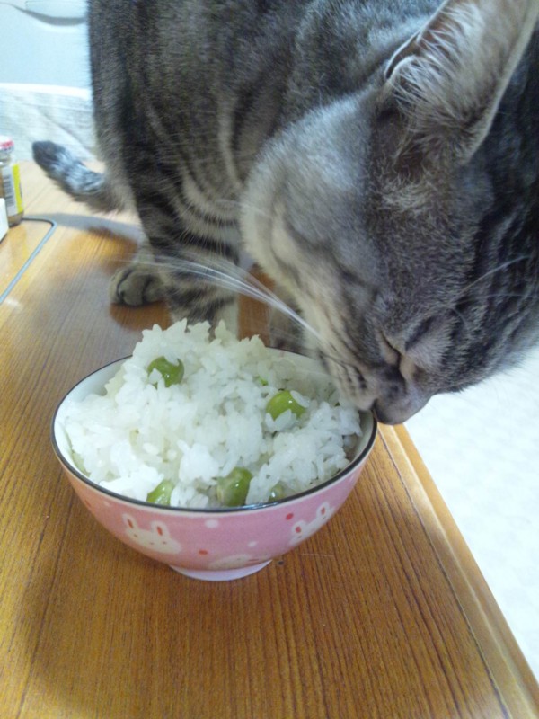 回鍋肉とマヨネーズ仕立て卯の花と豆ごはんと豆ごはんを狙ううちの猫